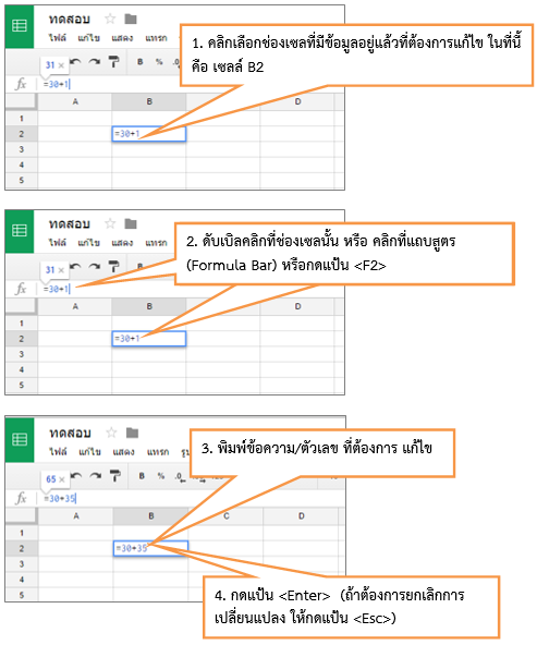 การแก้ไขข้อมูล การแก้ไขข้อมูลบางส่วนในช่องเซล มีวิธีการดังนี้